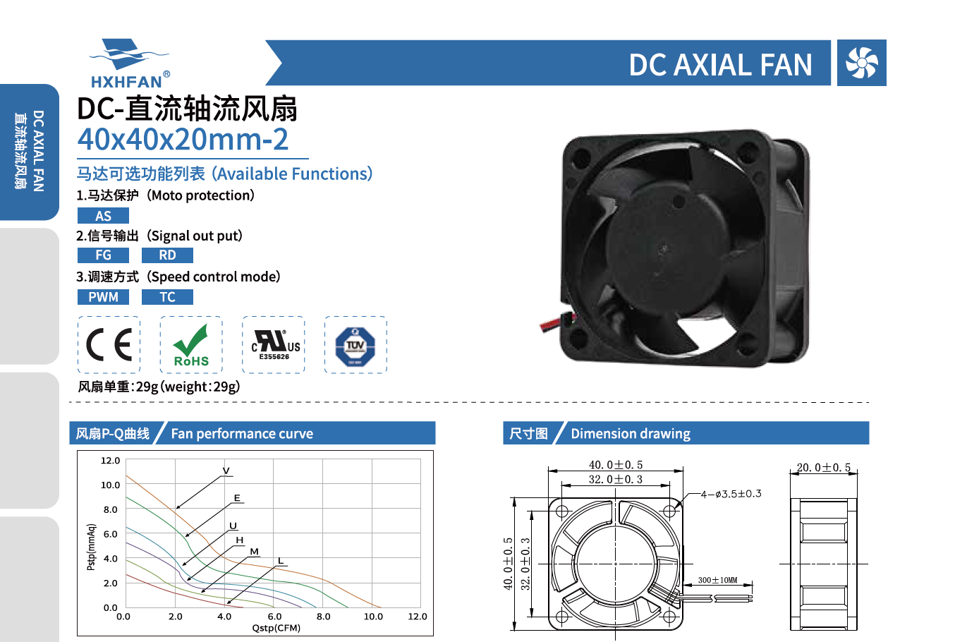 | Part NO. | Function | System | VDC | VDC | A | W | RPM | M3/min | CFM | mmH2O | INH2O | dBA |