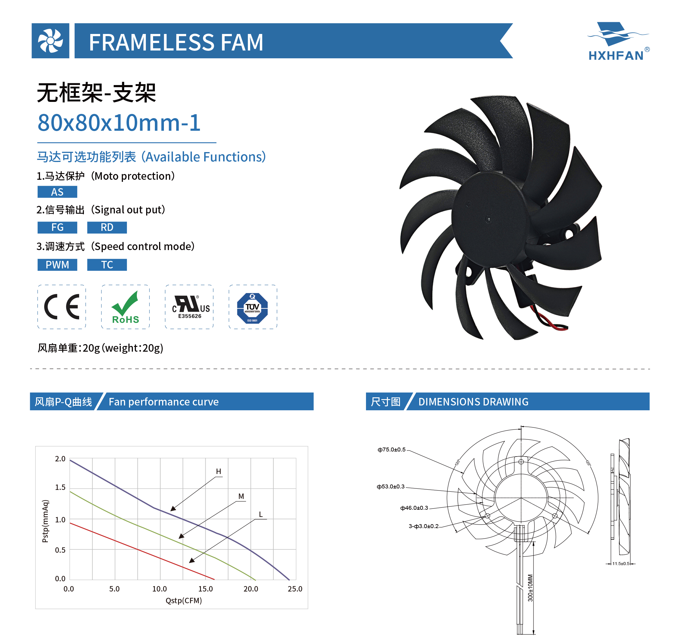 | Part NO. | Function | System | VDC | VDC | A | W | RPM | M3/min | CFM | mmH2O | INH2O | dBA |