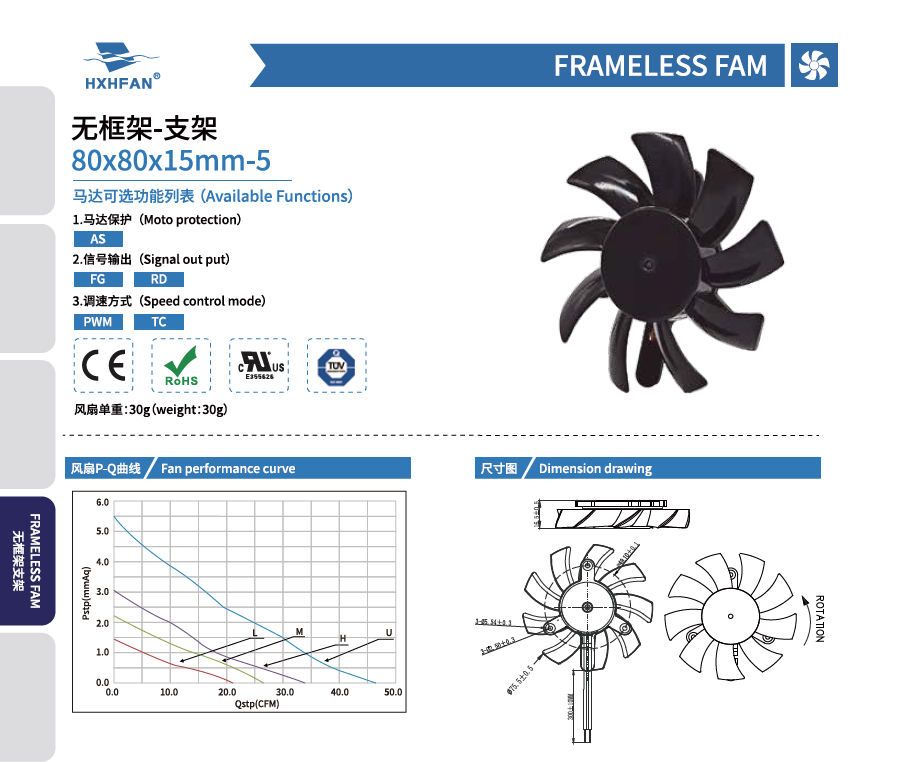 | Part NO. | Function | System | VDC | VDC | A | W | RPM | M3/min | CFM | mmH2O | INH2O | dBA |