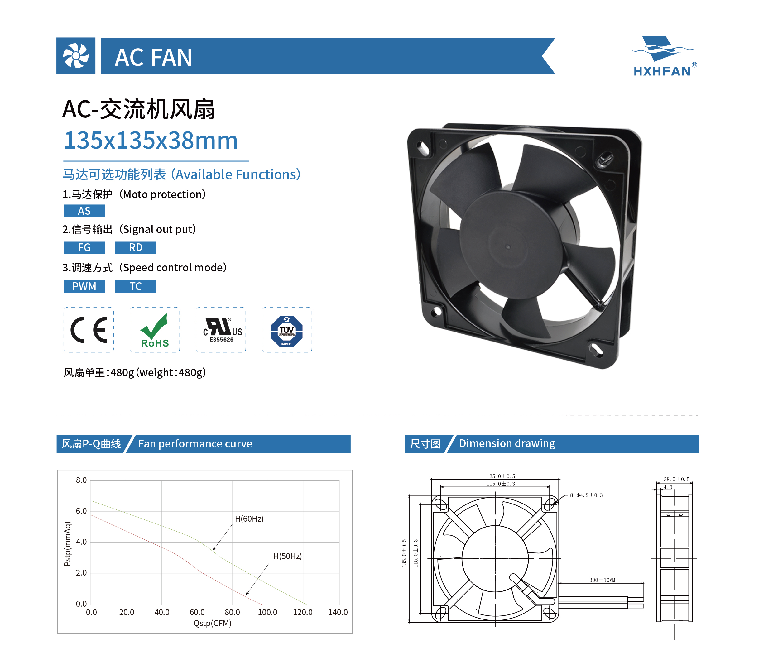 | Model | Bearing | Rated Voltage | Voltage Range | Freq. | Current | Speed | Air Flow | Static Pressure | Noise | |||