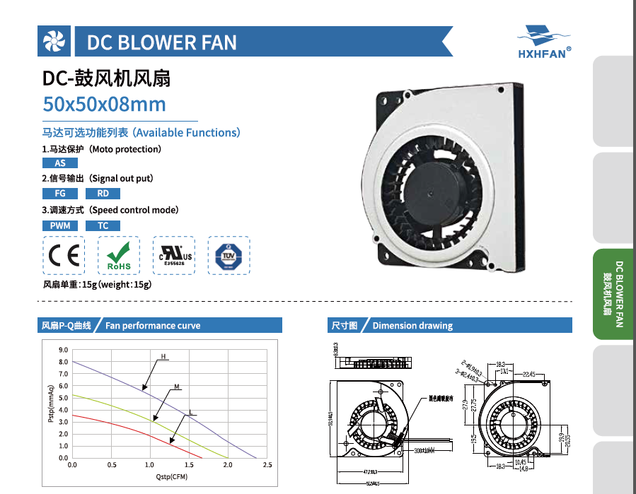 | Part NO. | Function | System | VDC | VDC | A | W | RPM | M3/min | CFM | mmH2O | INH2O | dBA |