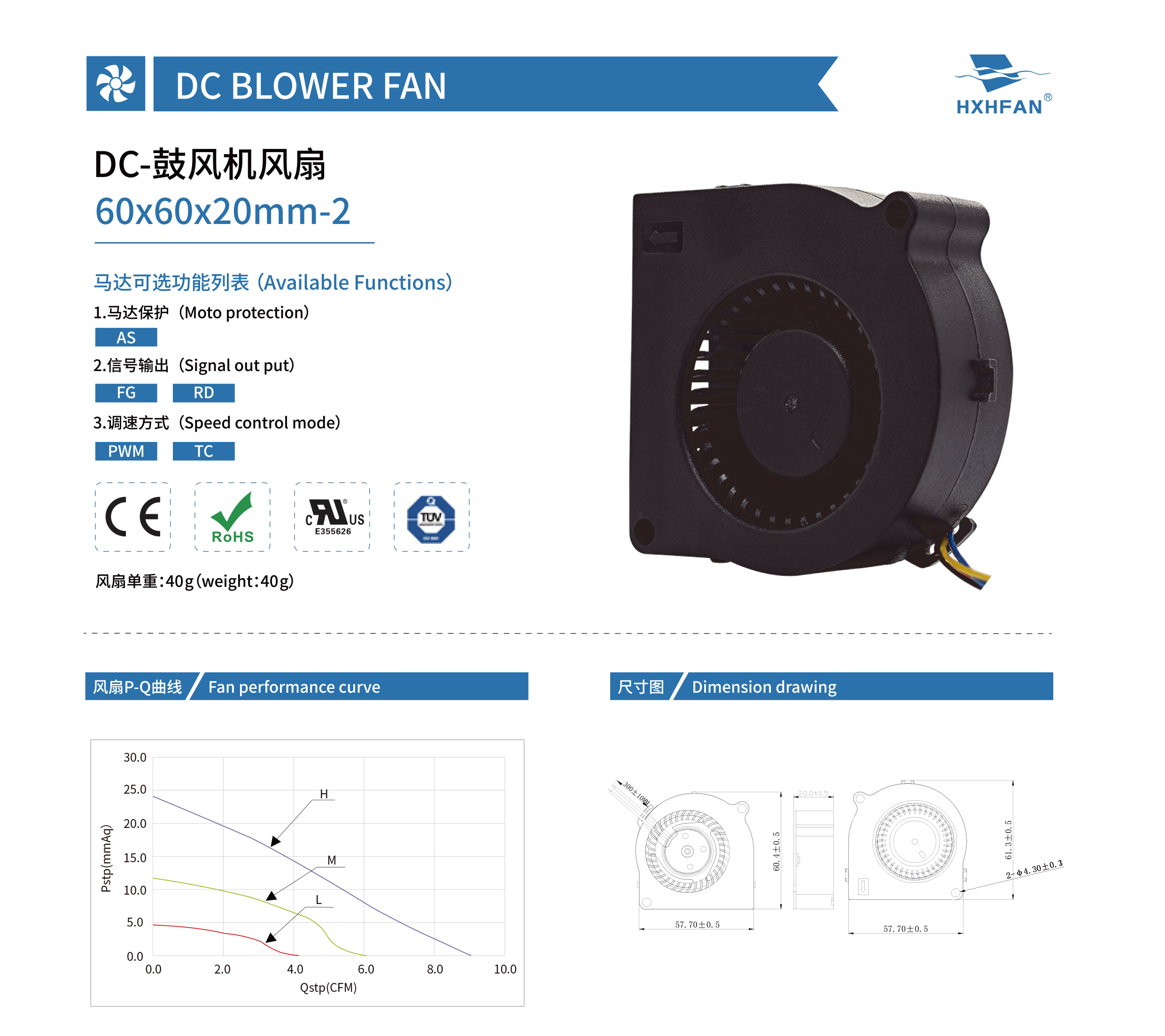 | Part NO. | Function | System | VDC | VDC | A | W | RPM | M3/min | CFM | mmH2O | INH2O | dBA |