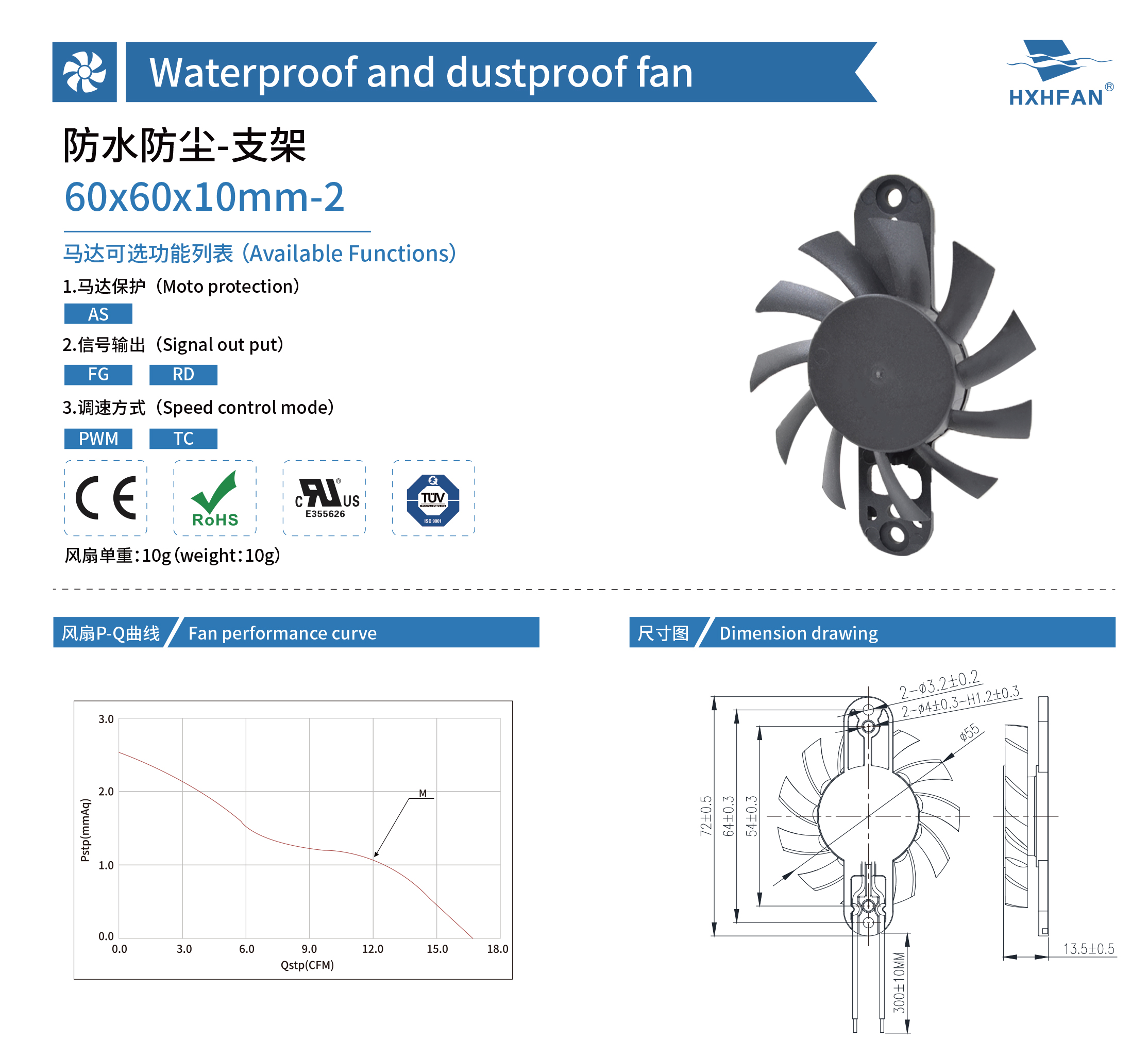 | Part NO. | Function | System | VDC | VDC | A | W | RPM | M3/min | CFM | mmH2O | INH2O | dBA |