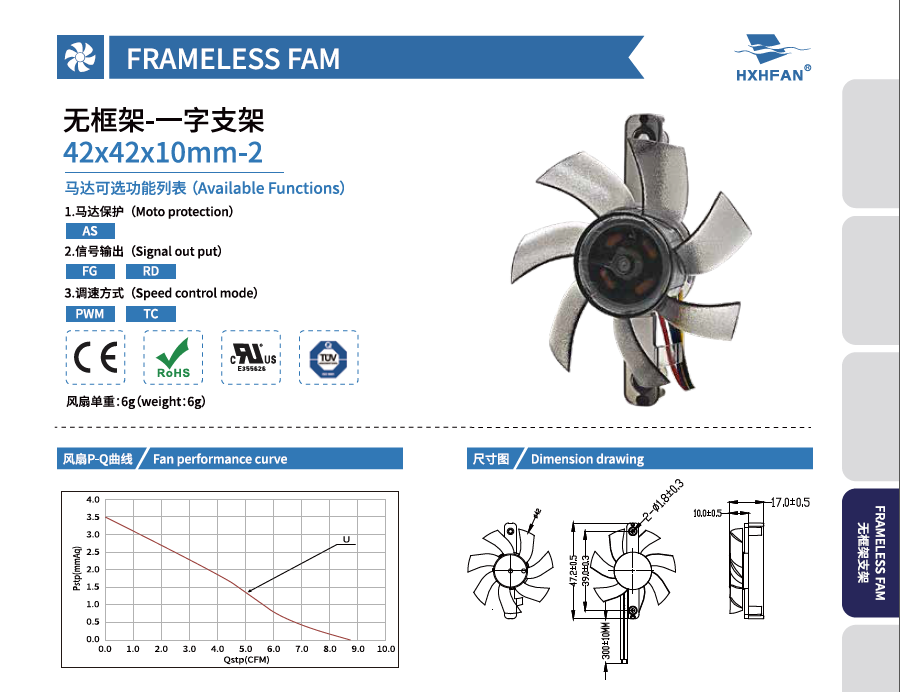 | Part NO. | Function | System | VDC | VDC | A | W | RPM | M3/min | CFM | mmH2O | INH2O | dBA |