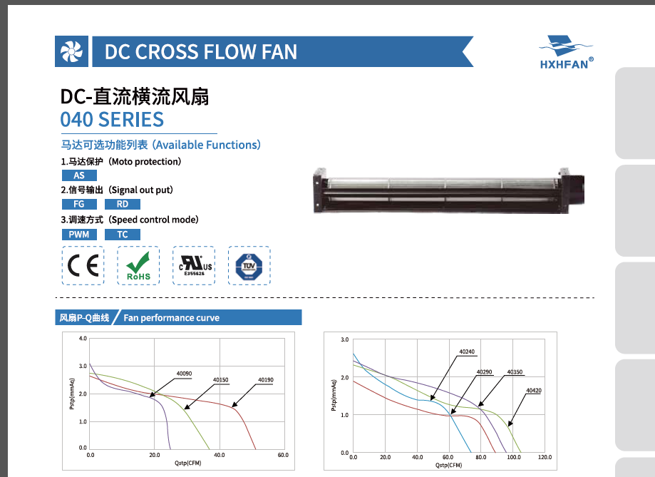 | Part NO. | System | A | B | C | VDC | A | W | RPM | M3/min | CFM | mmH2O | INH2O | dBA |