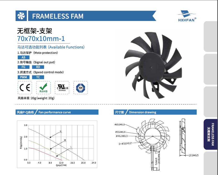 | Part NO. | Function | System | VDC | VDC | A | W | RPM | M3/min | CFM | mmH2O | INH2O | dBA |