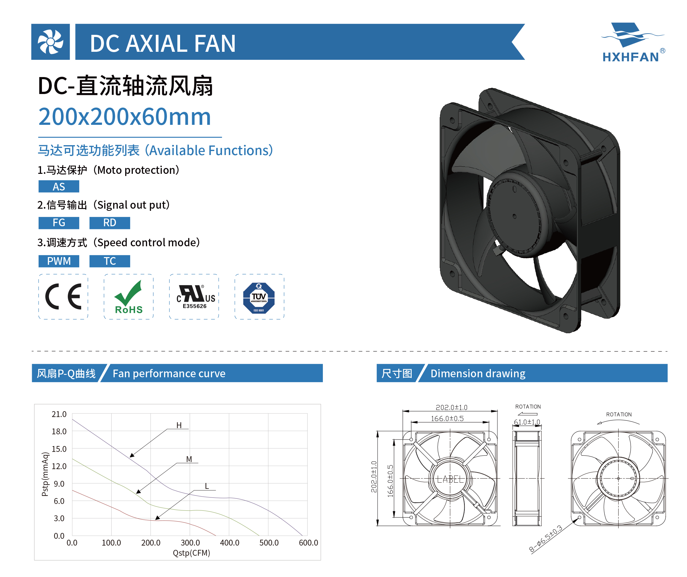 | Part NO. | Function | System | VDC | VDC | A | W | RPM | M3/min | CFM | mmH2O | INH2O | dBA |