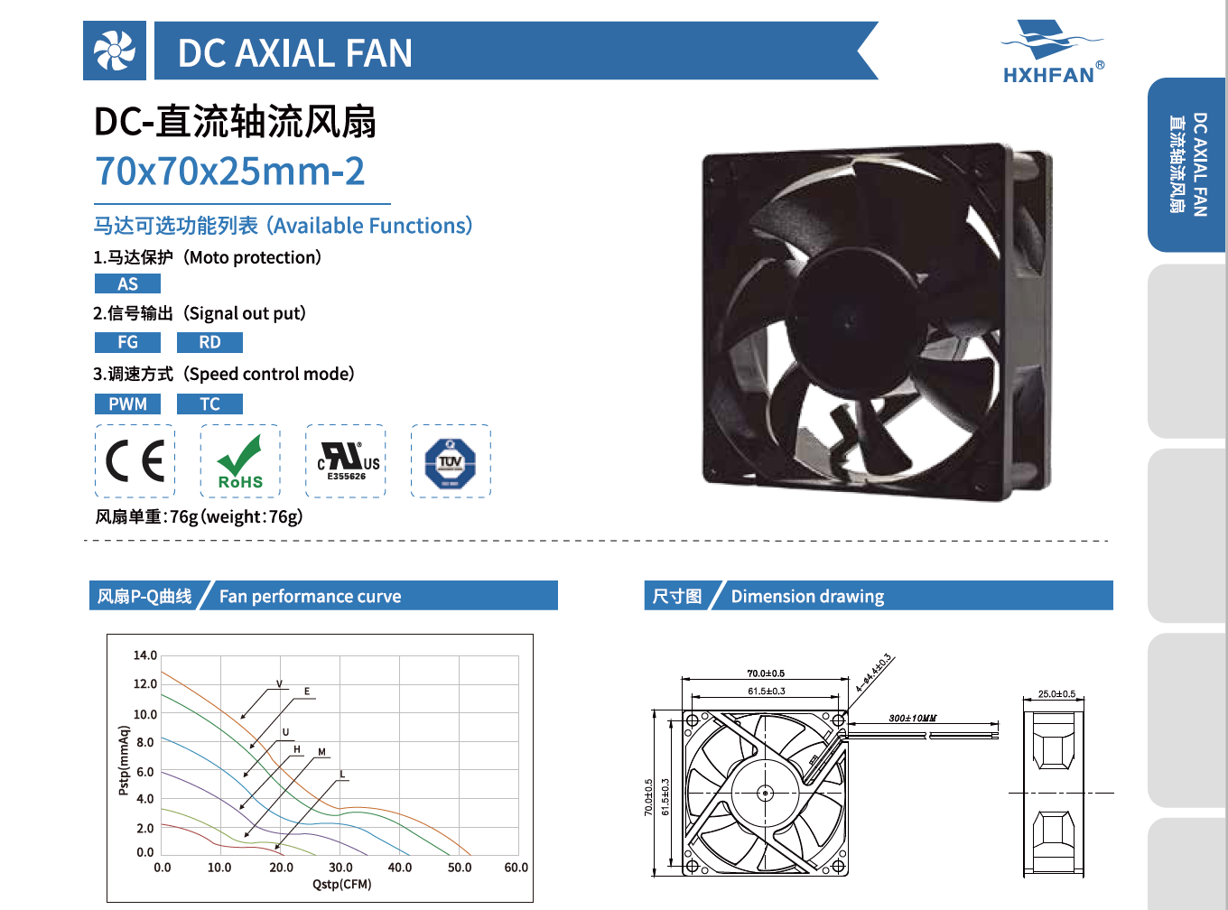 | Part NO. | Function | System | VDC | VDC | A | W | RPM | M3/min | CFM | mmH2O | INH2O | dBA |