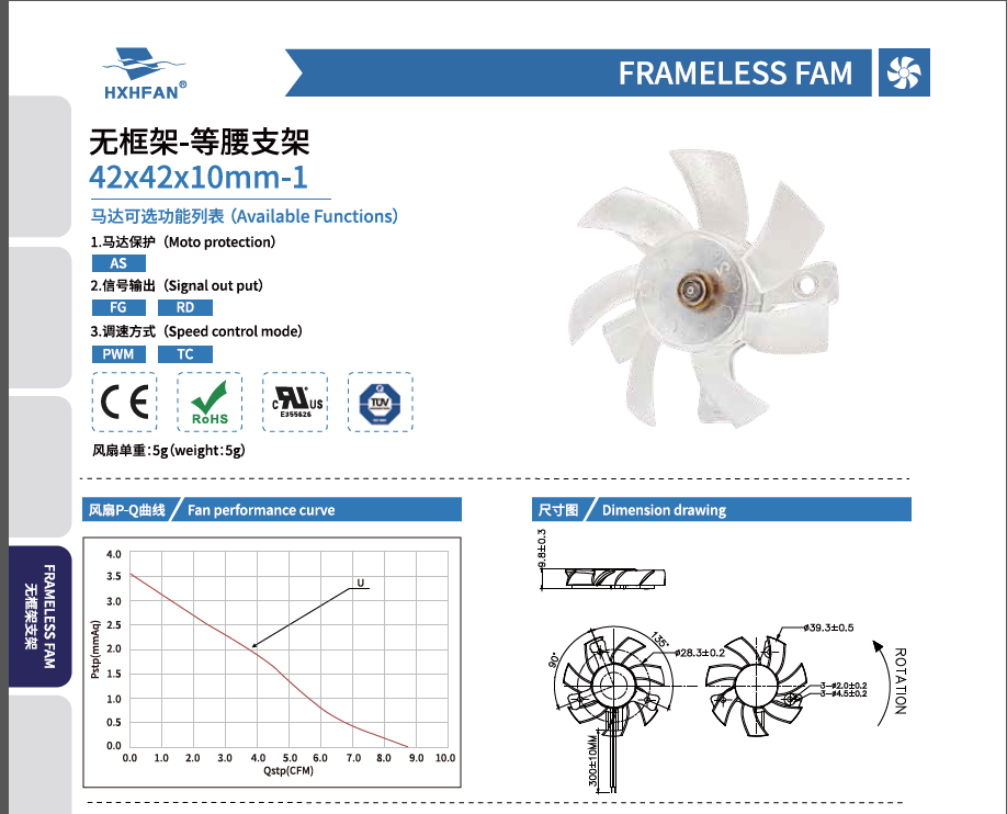 | Part NO. | Function | System | VDC | VDC | A | W | RPM | M3/min | CFM | mmH2O | INH2O | dBA |